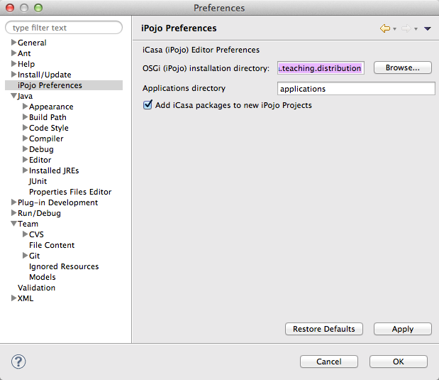 If you use different distribution of iCASA (or the same version but in different directories), you will have to reconfigure your workspace and restart Eclipse.