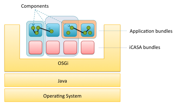 An application is made of a number of interacting iPOJO components. These components are linked at runtime, throuh service interactions, by the execution framework. An application can be run only when all service dependencies are resolved.