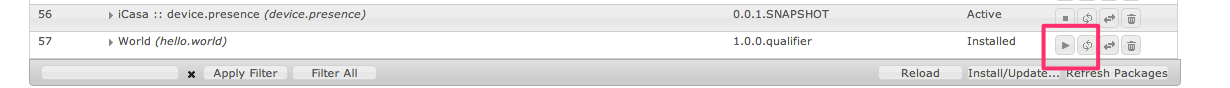 Check out your terminal: it should print “Hello World !” when the bundle is started, “Good bye World !” when the bundle is stopped.