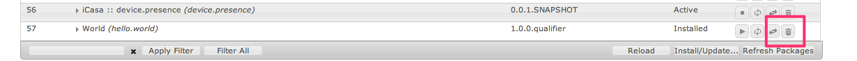 OSGi provides facilities to manage installed bundles. The iCasa runtime comes with the Apache Felix Web Console, a very handy tool to manage the bundles from your Web browser.